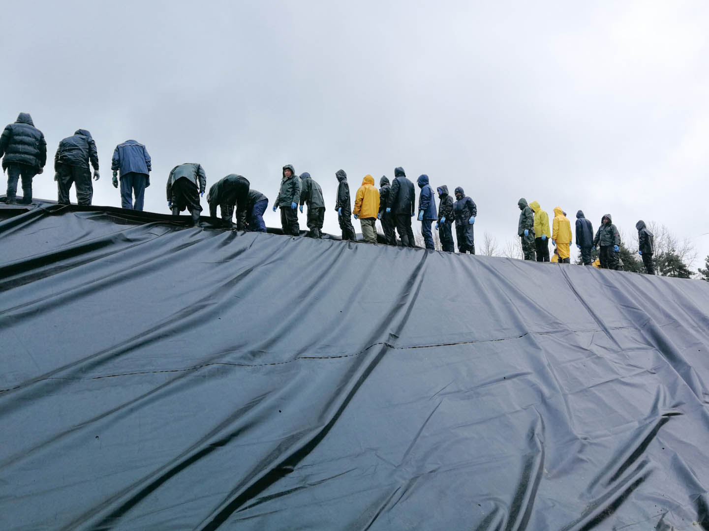 Nach dem Transport der Tanks und der Auskleidungen über den Atlantik ist unser Team mehrmals für die Montage vor Ort nach Kanada geflogen. Die 0,6 mm dicke FPP-Folie wurde in den Becken verlegt, Böschungsschutz und Durchführungen wurden eingebaut. Auch eine Abdeckung wurde installiert, um das Wasser sauber zu halten und vor Verdunstung zu schützen.