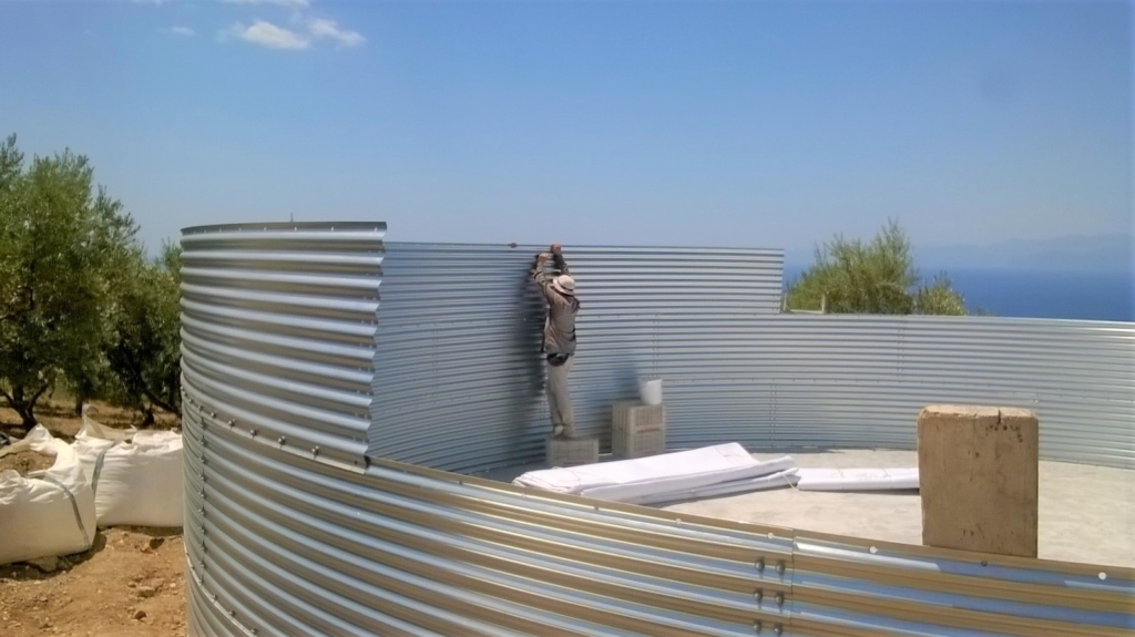 A través de nuestro socio, entregamos silos de agua metálicos que se instalaron en diferentes ubicaciones en las remotas colinas de Lakonia en el sur de Grecia. En combinación con sistemas fotovoltaicos, los productores de olivas pueden regar fácilmente los olivos con los depósitos de agua y almacenar el agua cerca de los olivos.