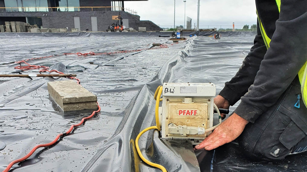De drie enorme LDPE kleden werden op onze productielocatie in Tzummarum geprefabriceerd en ter plaatse aan elkaar gelast. In de zijwand werden maar liefst 17 doorvoeren geïnstalleerd, die aansluiting hebben op de drainagebuizen.