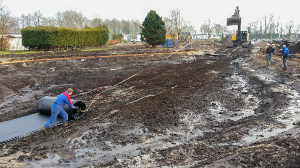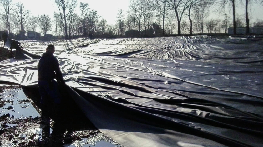 Voor een pittoresk vakantiepark nabij het Veluwemeer realiseerde de NPI in 2015 de folie voor een prachtige vijverpartij. Het PVC vijverfolie van 1 mm werd in op onze productielocatie in Tzummarum prefab gelast. In delen werd de folie op het vakantiepark geleverd en ter plekke aan elkaar gelast. Wegens het hoge grondwaterpeil was het een uitdaging om de vijverfolie op locatie te lassen. Het eindresultaat is er echter niet minder om!