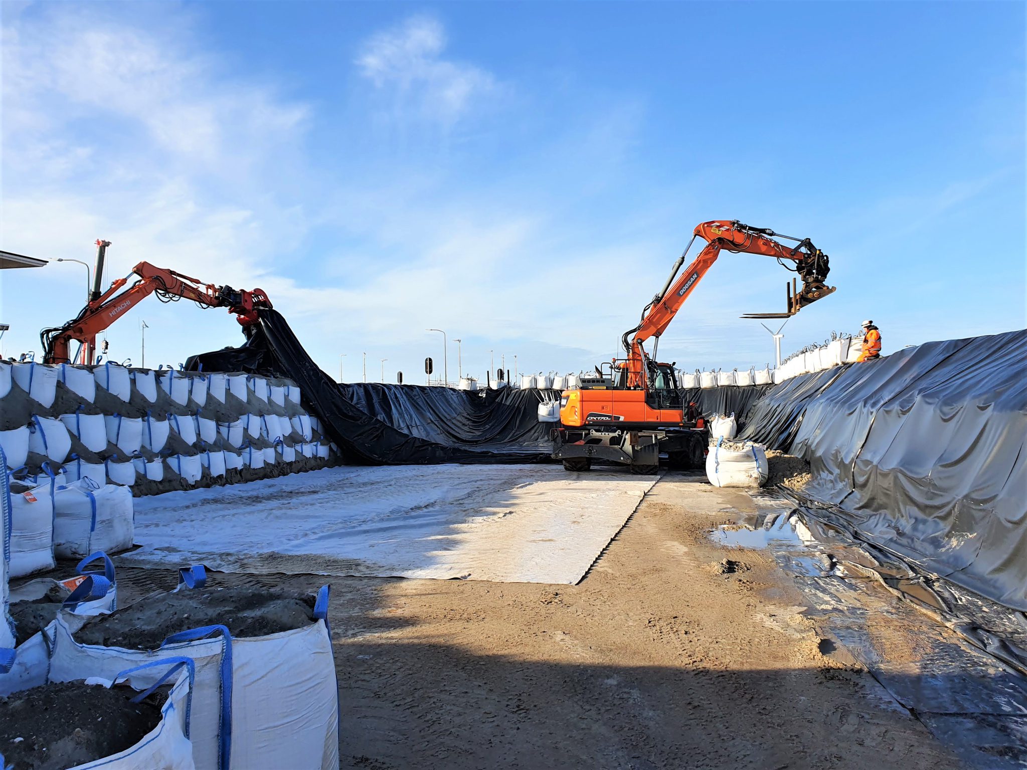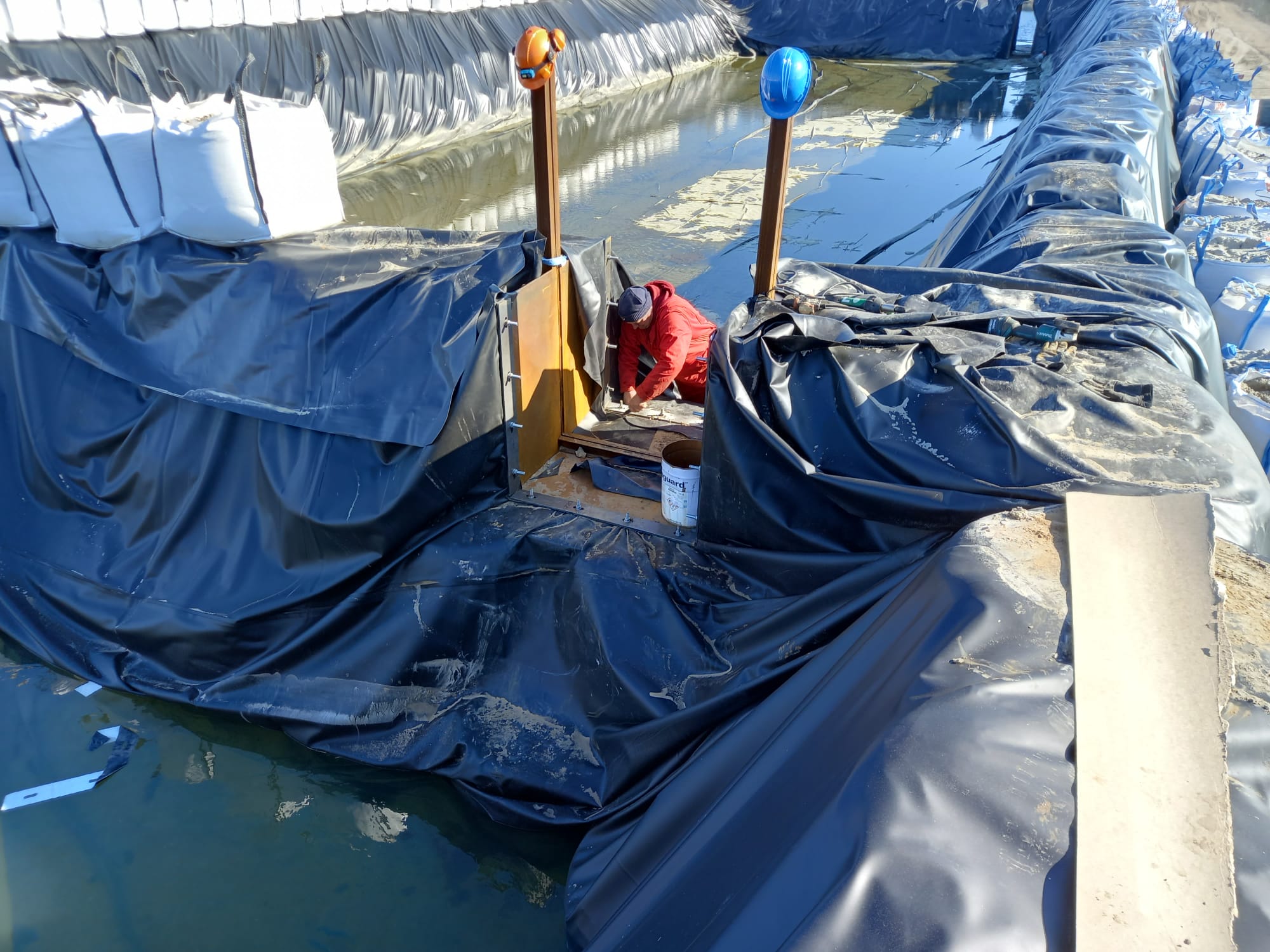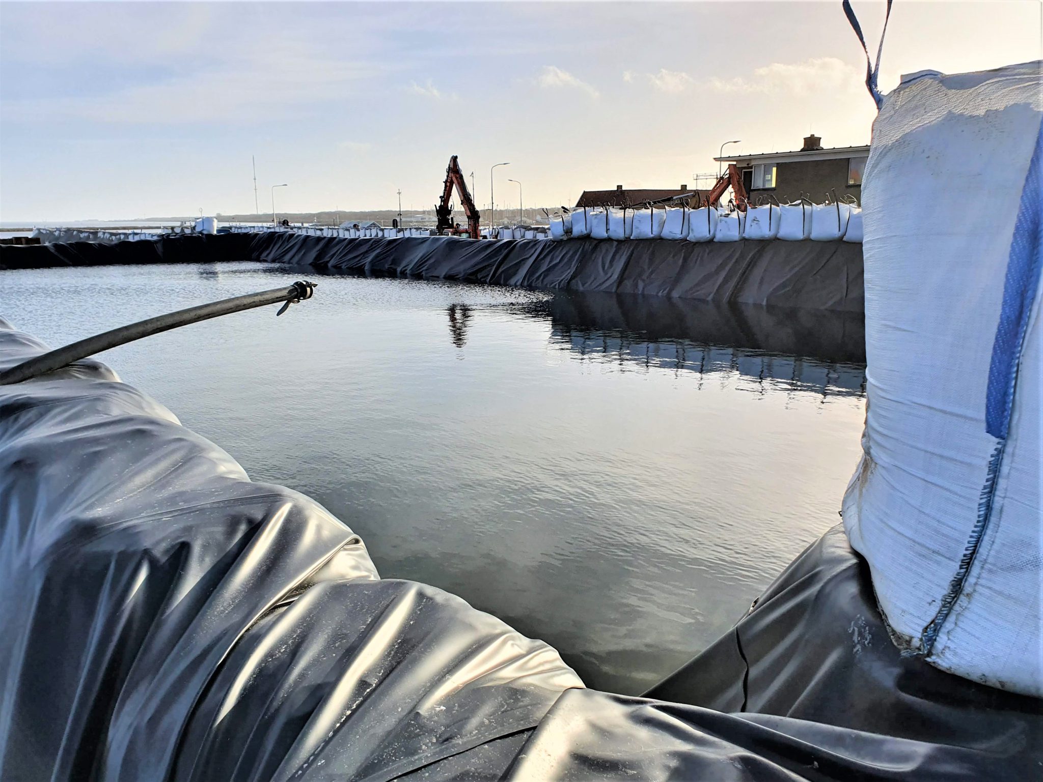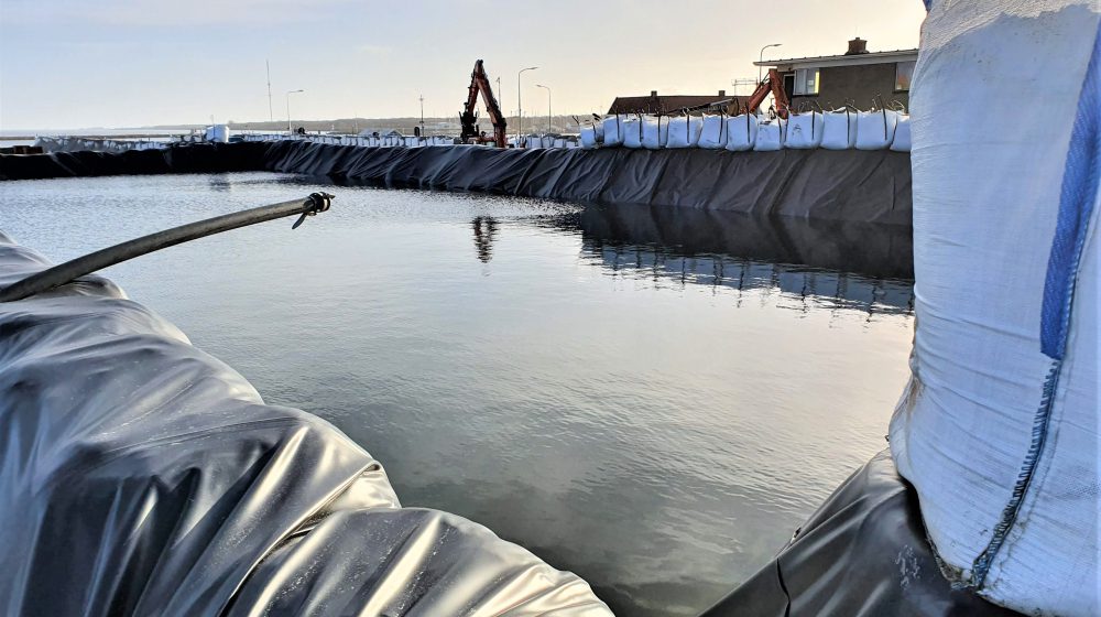 We lined temporary sludge basins near Den Oever, a village located at west end of the Afsluitdijk. The sludge that is pumped up from the IJsselmeer to create space for underwater structures is stored in these basins to settle it. It will eventually be drained and the remaining water will be returned to the IJsselmeer.