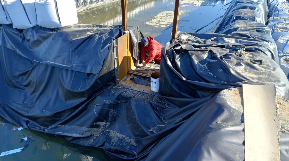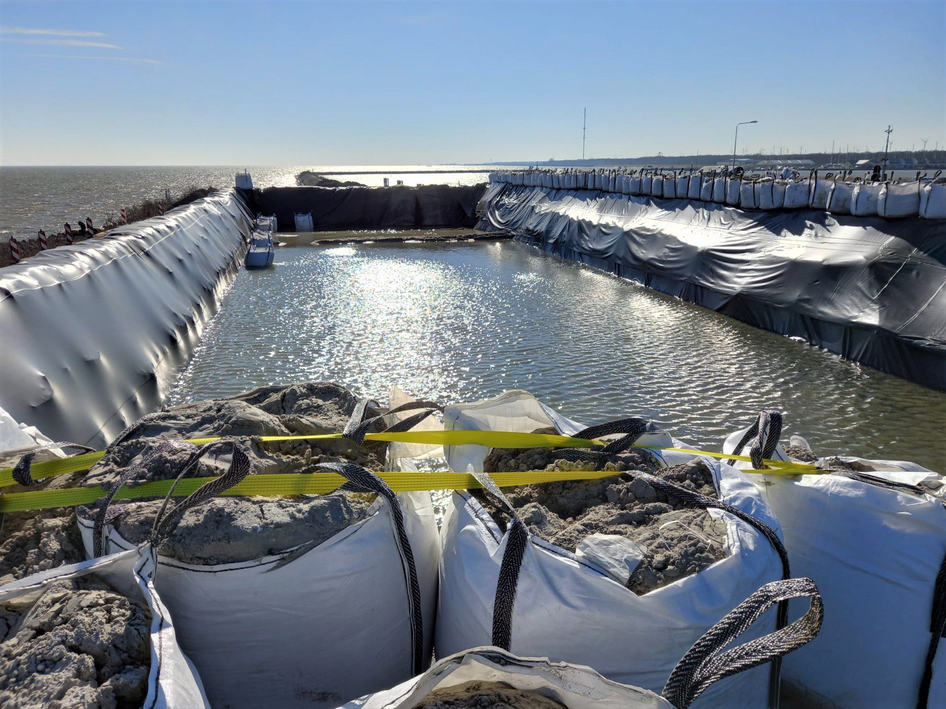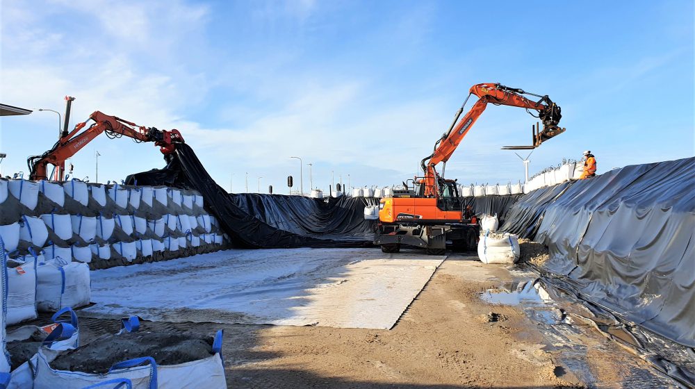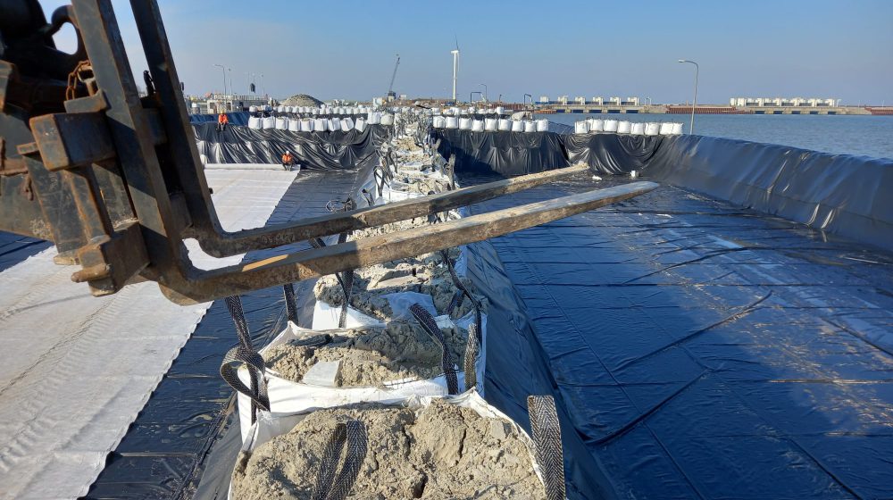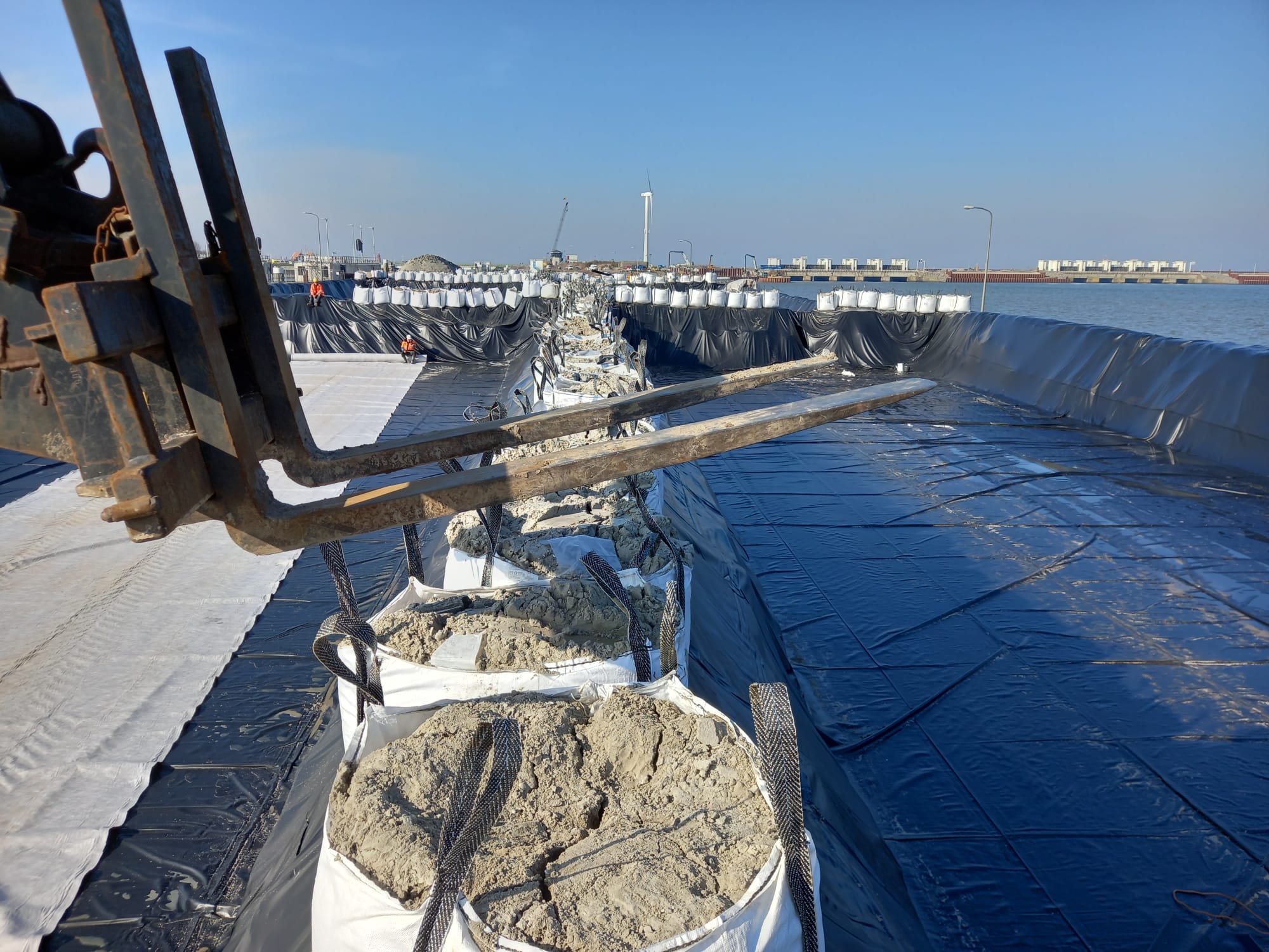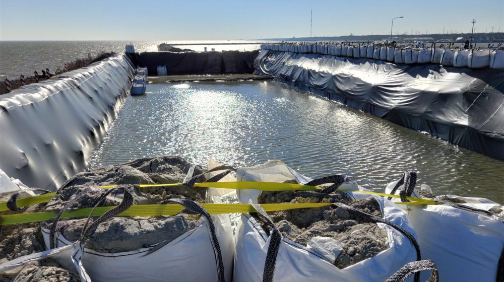 We lined temporary sludge basins near Den Oever, a village located at west end of the Afsluitdijk. The sludge that is pumped up from the IJsselmeer to create space for underwater structures is stored in these basins to settle it. It will eventually be drained and the remaining water will be returned to the IJsselmeer.
